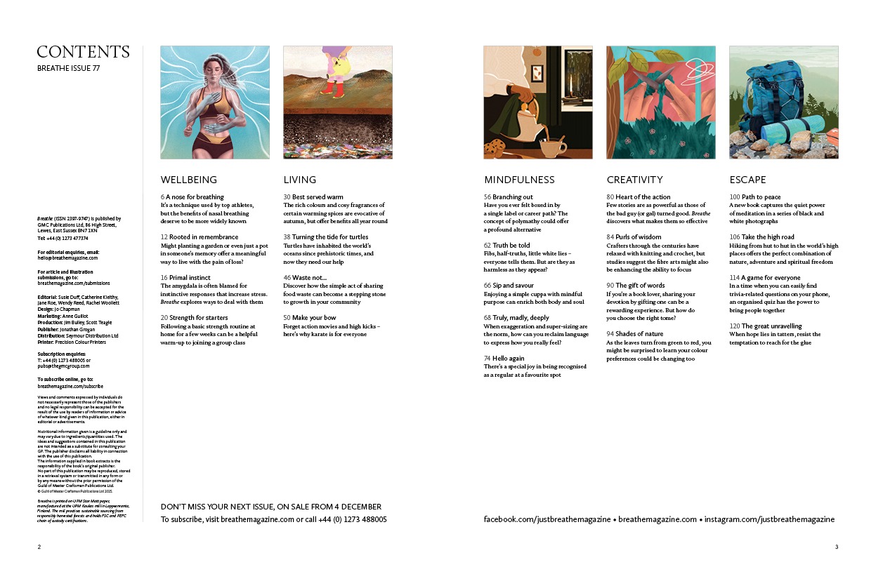 In this issue: Shades of nature – Truly, madly, deeply – Strength for starters – Heart of the action – Purls of wisdom – Best served warm – Rooted in remembrance – Primal instinct – Take the high road – Sip and savour